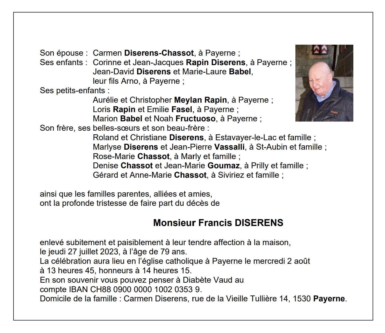 Monsieur Francis DISERENS 23 avr. 1944 - 27 juil. 2023 Avis mortuaire PFG Télecharger PDF Partager sur: Galerie PreviousNext PreviousNext