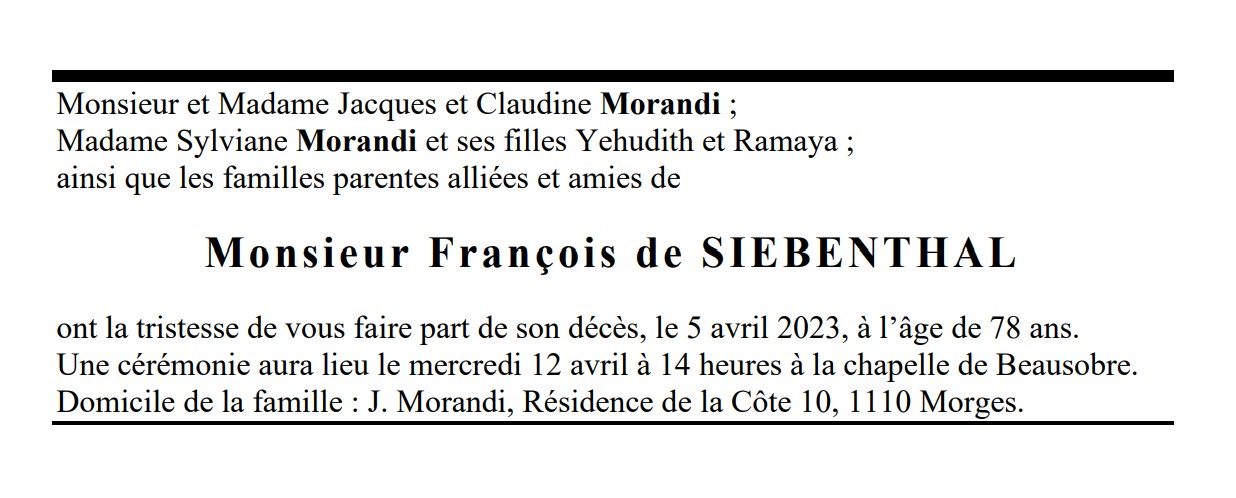 Monsieur François de SIEBENTHAL 30 mai. 1945 - 05 avr. 2023 Avis mortuaire PFG Télecharger PDF Partager sur: Galerie PreviousNext PreviousNext