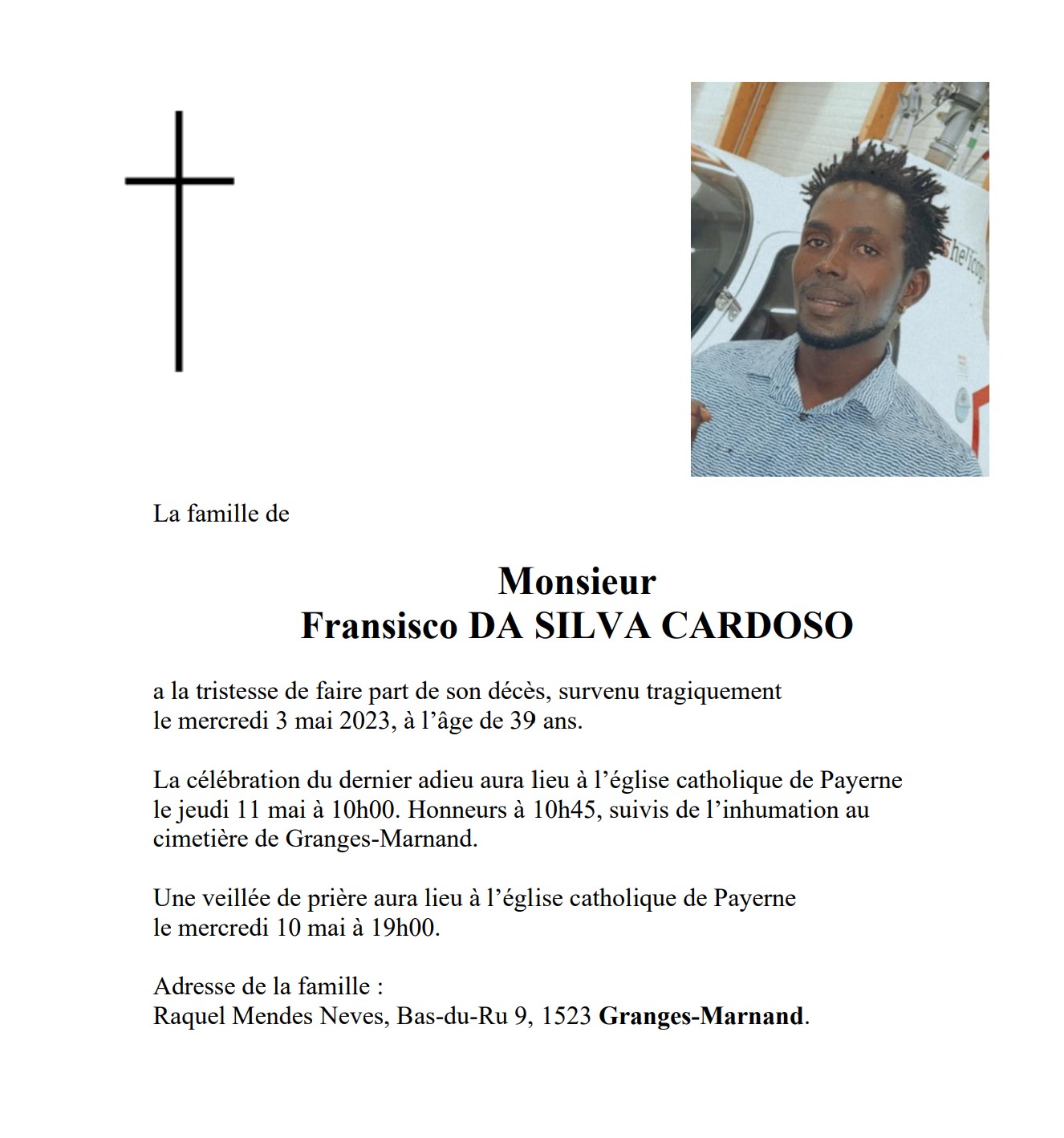 Monsieur Fransisco DA SILVA CARDOSO 25 oct. 2023 - 03 mai. 2023 Avis mortuaire PFG Télecharger PDF Partager sur: Galerie PreviousNext PreviousNext