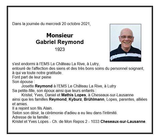 Monsieur Gabriel Reymond 15 avr. 1923 - 20 oct. 2021 Avis mortuaire PFG Télecharger PDF Partager sur: Galerie PreviousNext PreviousNext