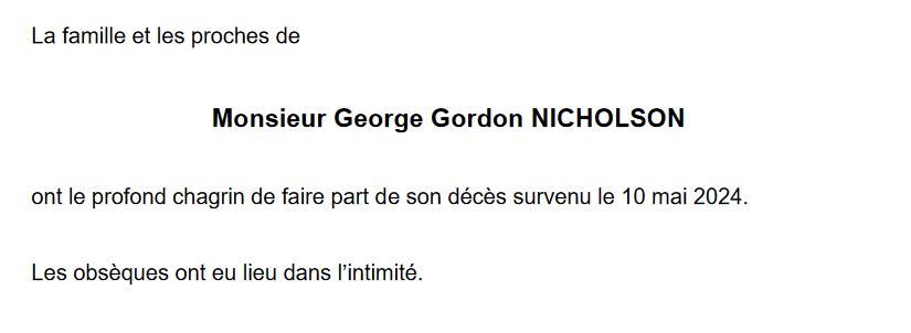 Monsieur George Gordon NICHOLSON 05 juin. 1942 - 10 mai. 2024 Avis mortuaire PFG Télecharger PDF Partager sur: Galerie PreviousNext PreviousNext