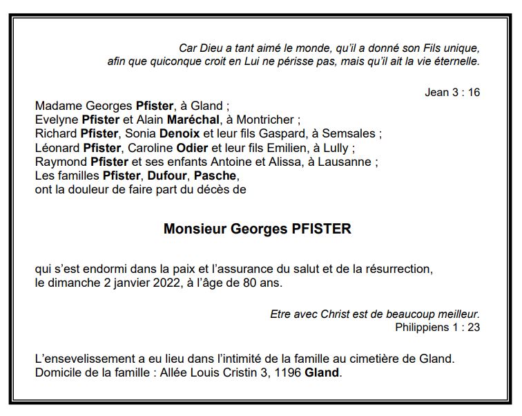 Monsieur Georges PFISTER 13 fév. 1941 - 02 jan. 2022 Avis mortuaire PFG Télecharger PDF Partager sur: Galerie PreviousNext PreviousNext