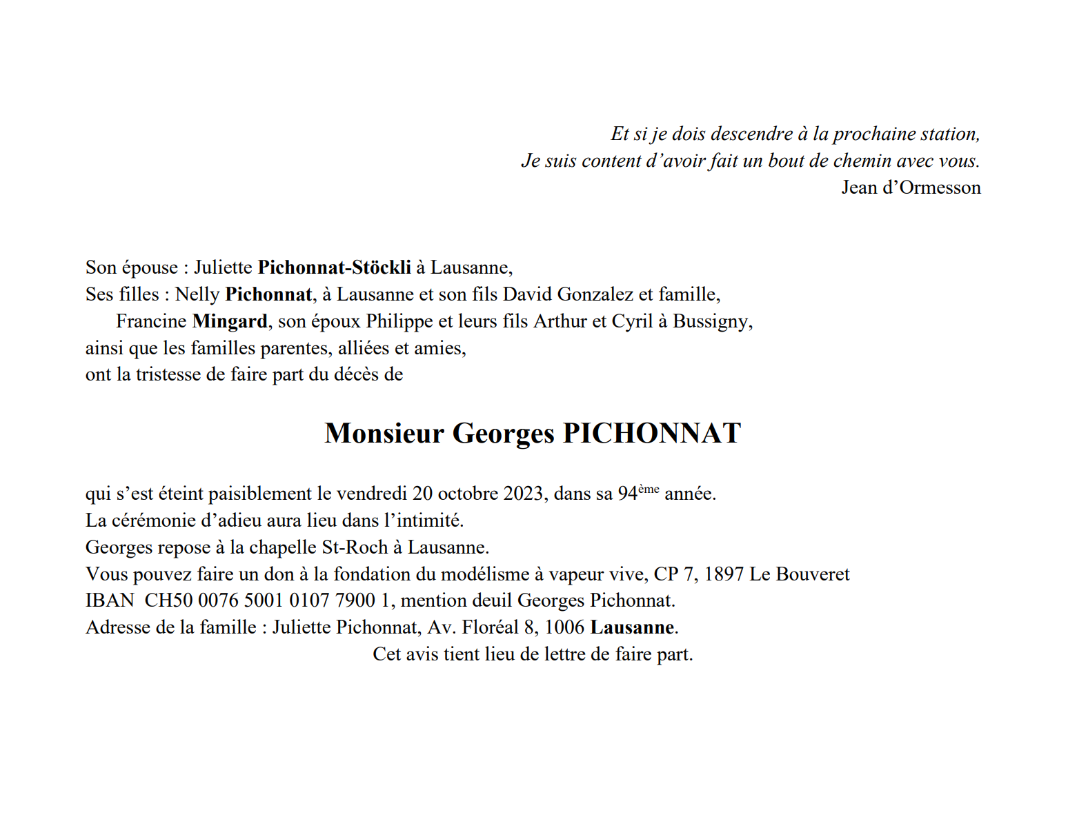Monsieur Georges PICHONNAT 21 déc. 1929 - 20 oct. 2023 Avis mortuaire PFG Télecharger PDF Partager sur: Galerie PreviousNext PreviousNext