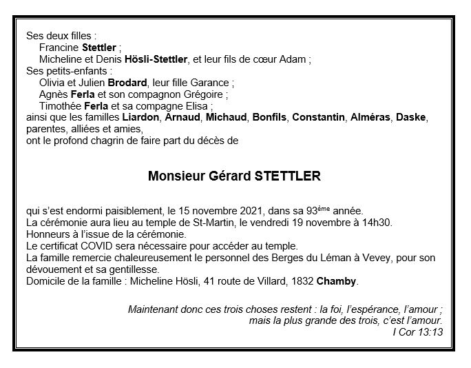 Monsieur Gérard STETTLER 17 juil. 1929 - 15 nov. 2021 Avis mortuaire PFG Télecharger PDF Partager sur: Galerie PreviousNext PreviousNext