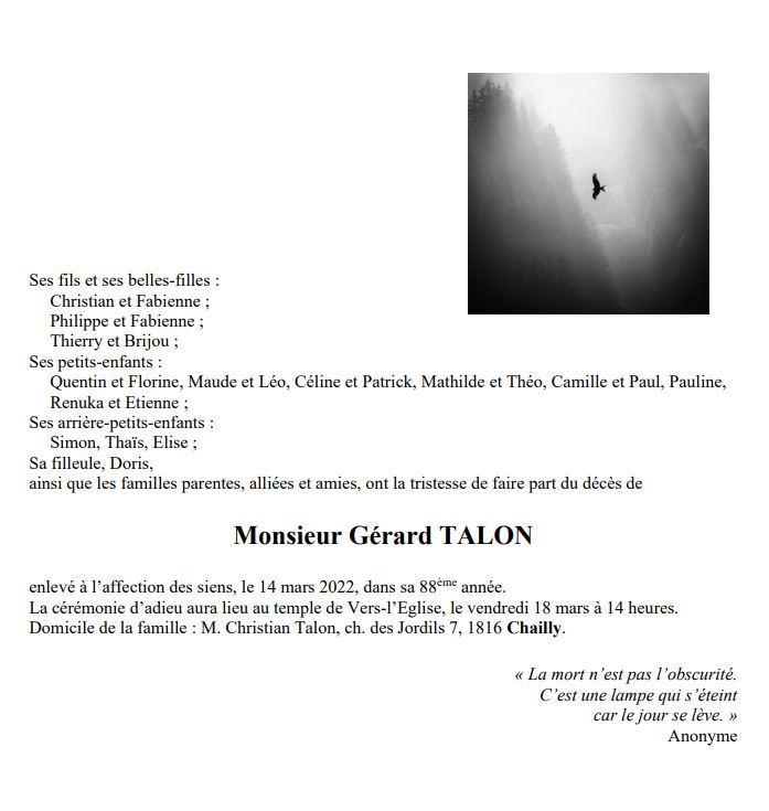 Monsieur Gérard TALON 29 avr. 1934 - 14 mar. 2022 Avis mortuaire PFG Télecharger PDF Partager sur: Galerie PreviousNext PreviousNext