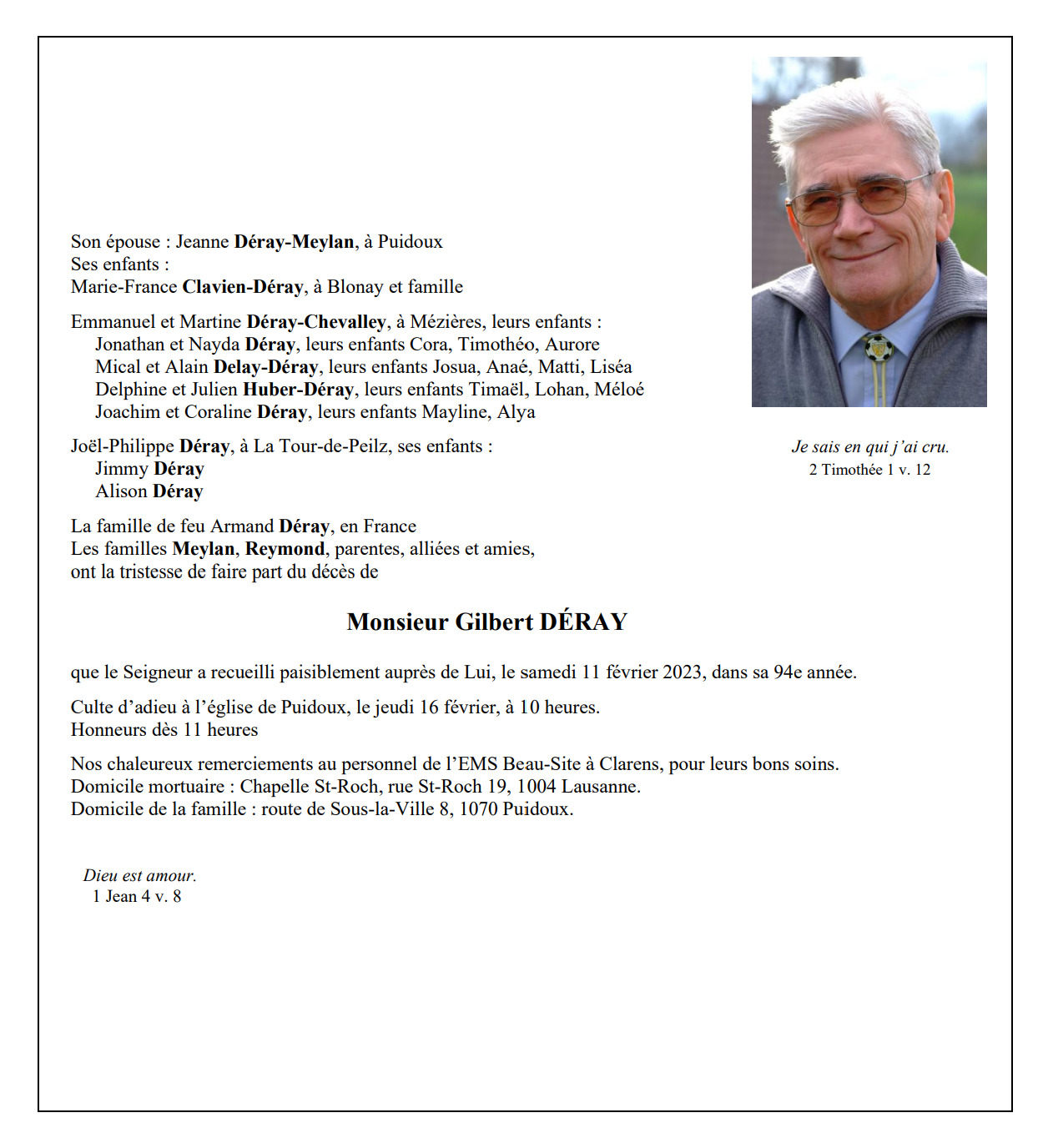 Monsieur Gilbert DÉRAY 15 aoû. 1929 - 11 fév. 2023 Avis mortuaire PFG Télecharger PDF Partager sur: Galerie PreviousNext PreviousNext