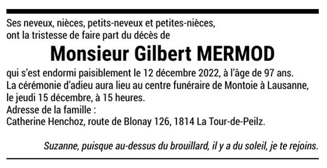 Monsieur Gilbert MERMOD 25 nov. 1925 - 12 déc. 2022 Avis mortuaire PFG Télecharger PDF Partager sur: Galerie PreviousNext PreviousNext