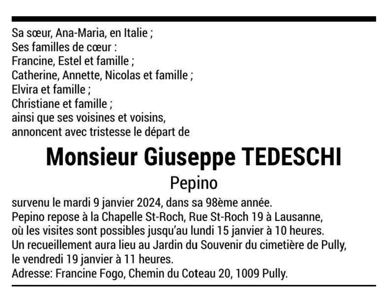 Monsieur Giuseppe TEDESCHI Pepino 27 sep. 1926 - 09 jan. 2024 Avis mortuaire PFG Télecharger PDF Partager sur: Galerie PreviousNext PreviousNext