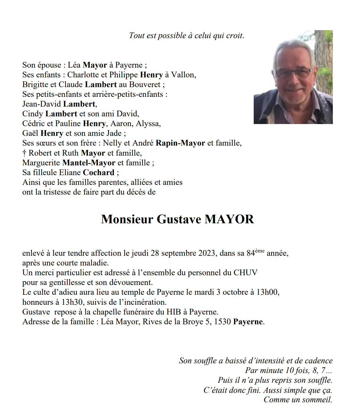 Monsieur Gustave MAYOR 06 nov. 1939 - 28 sep. 2023 Avis mortuaire PFG Télecharger PDF Partager sur: Galerie PreviousNext PreviousNext