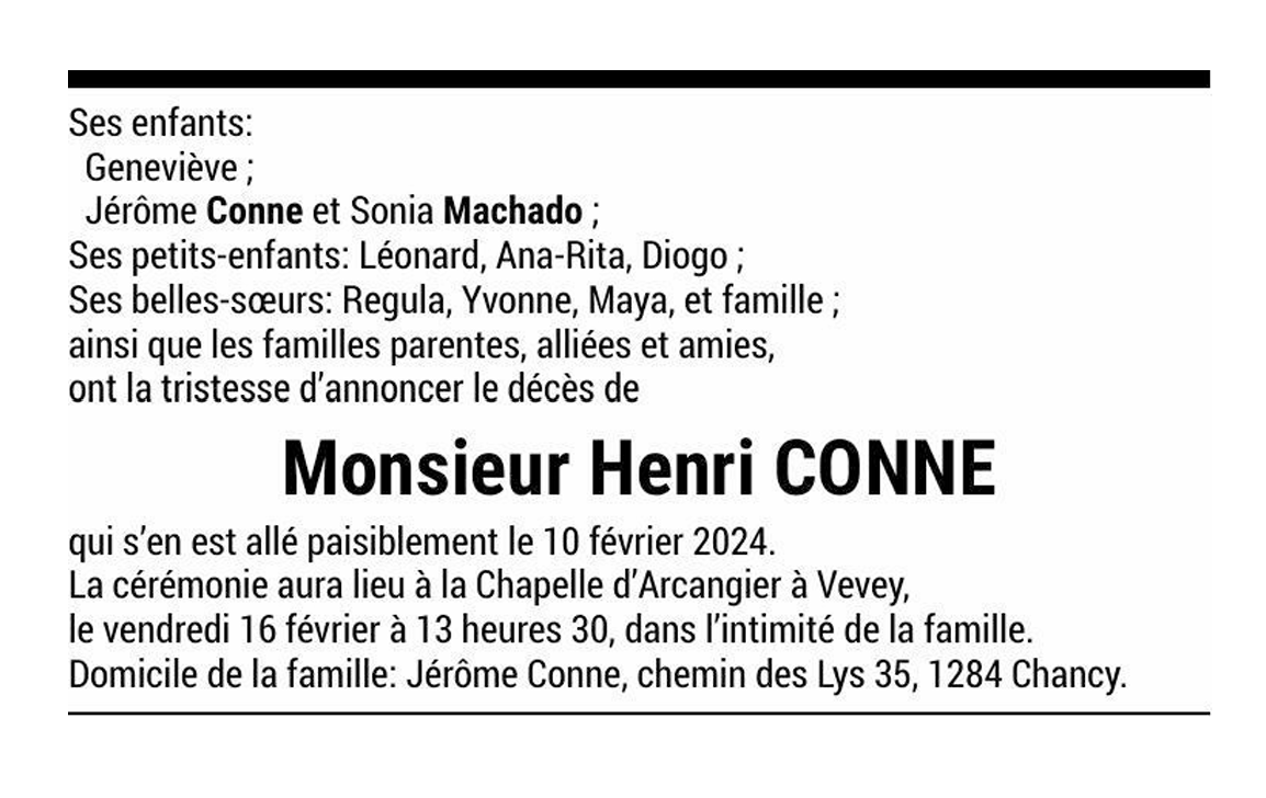 Monsieur Henri CONNE 10 nov. 1940 - 10 fév. 2024 Avis mortuaire PFG Télecharger PDF Partager sur: Galerie PreviousNext PreviousNext