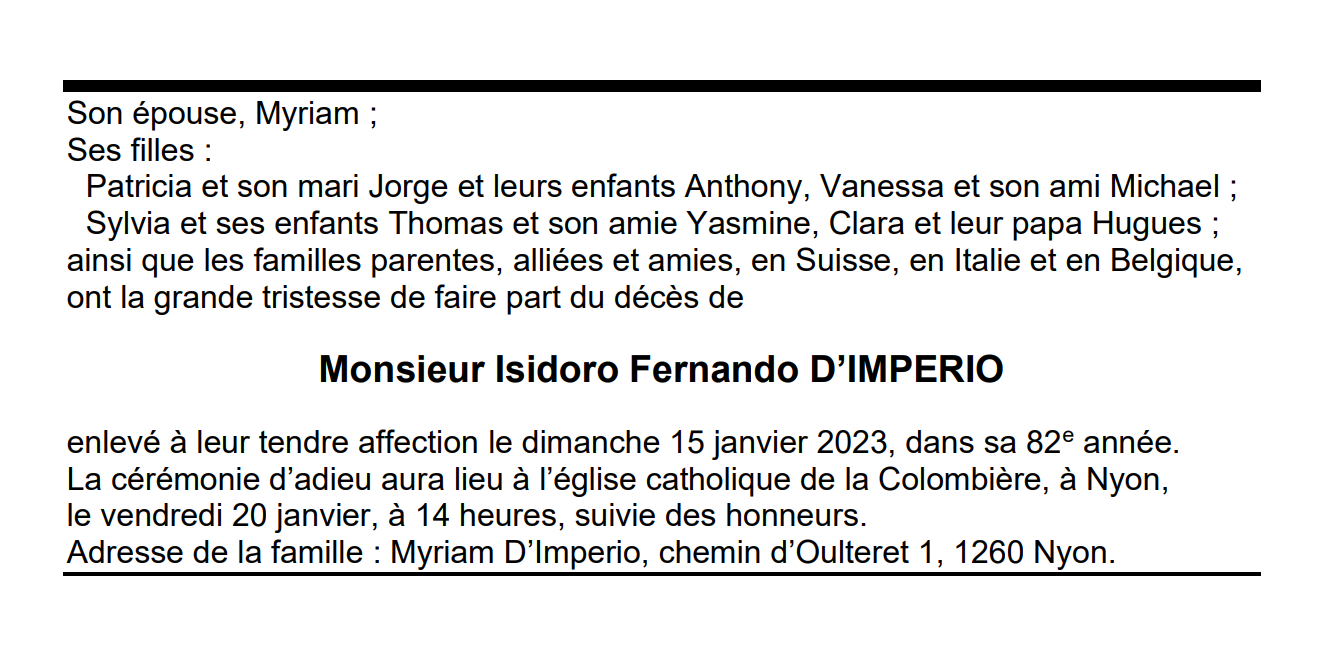 Monsieur Isidoro Fernando D’IMPERIO 08 oct. 1941 - 15 jan. 2023 Avis mortuaire PFG Télecharger PDF Partager sur: Galerie PreviousNext PreviousNext
