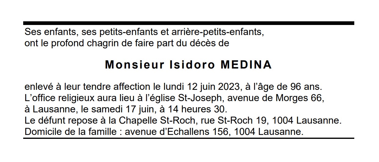 Monsieur Isidoro MEDINA 10 avr. 1927 - 12 juin. 2023 Avis mortuaire PFG Télecharger PDF Partager sur: Galerie PreviousNext PreviousNext