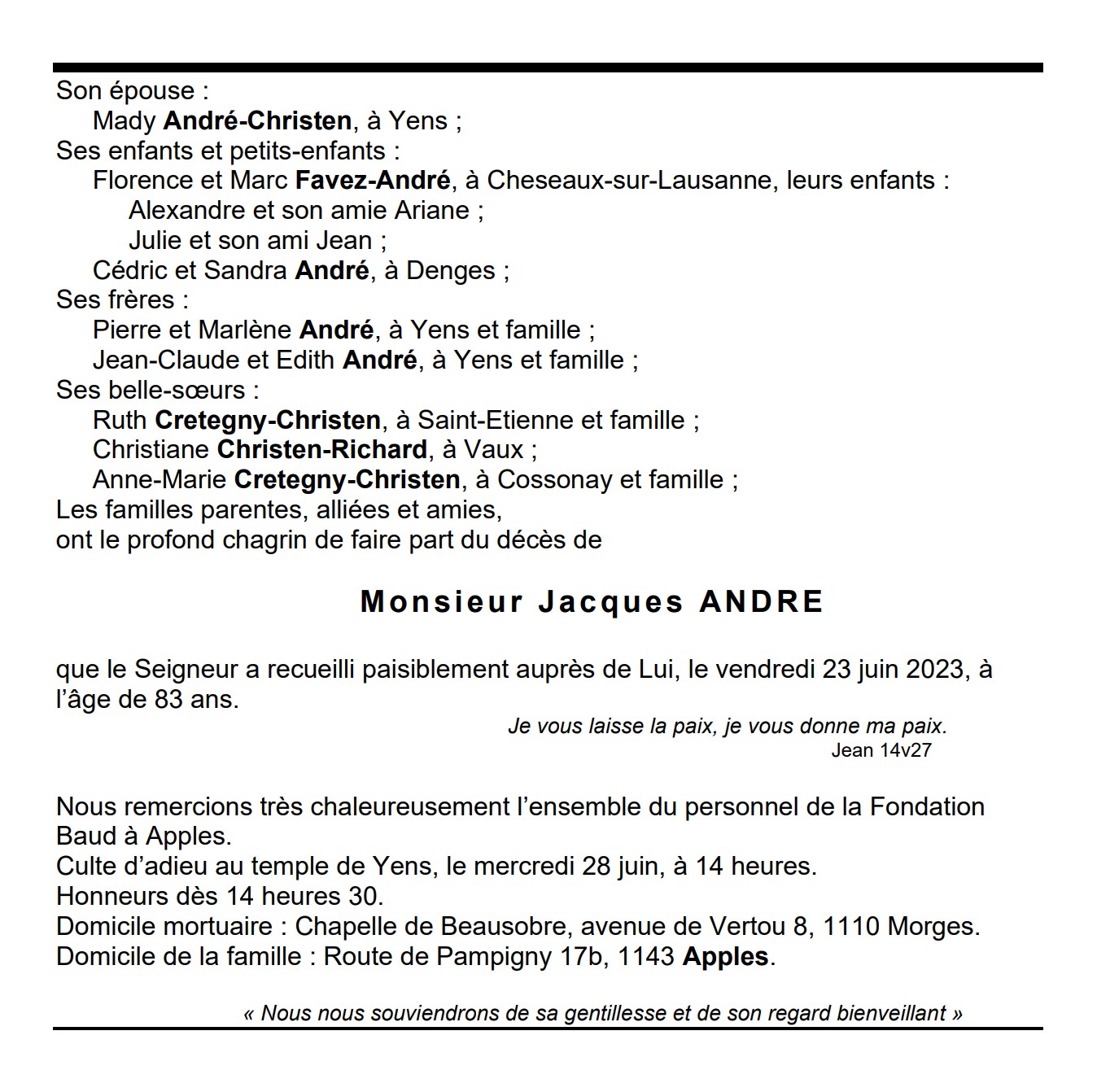 Monsieur Jacques ANDRE 17 mai. 1940 - 23 juin. 2023 Avis mortuaire PFG Télecharger PDF Partager sur: Galerie PreviousNext PreviousNext