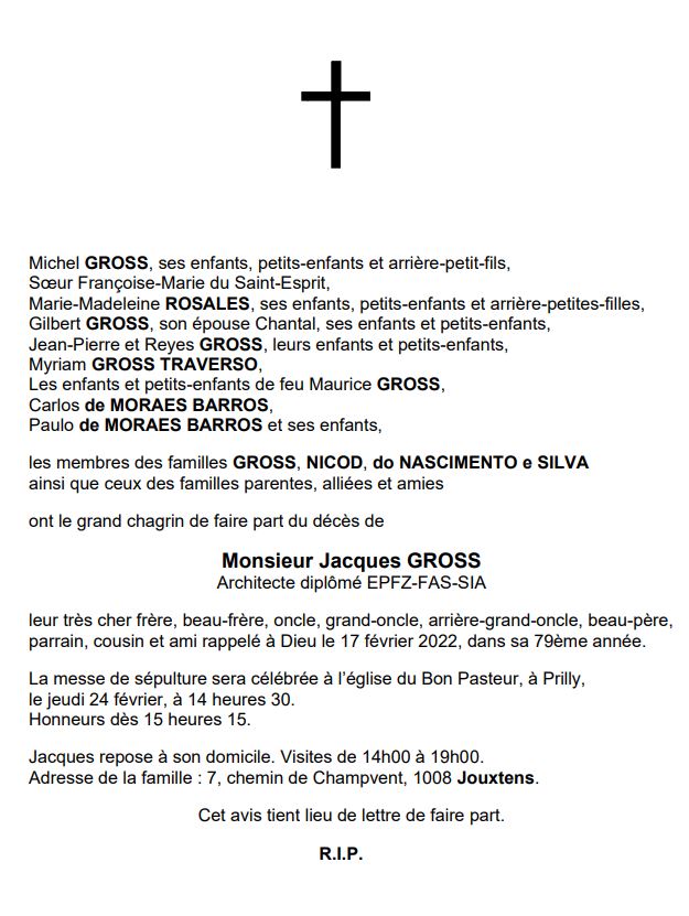 Monsieur Jacques GROSS 25 juin. 1943 - 17 fév. 2022 Avis mortuaire PFG Télecharger PDF Partager sur: Galerie PreviousNext PreviousNext