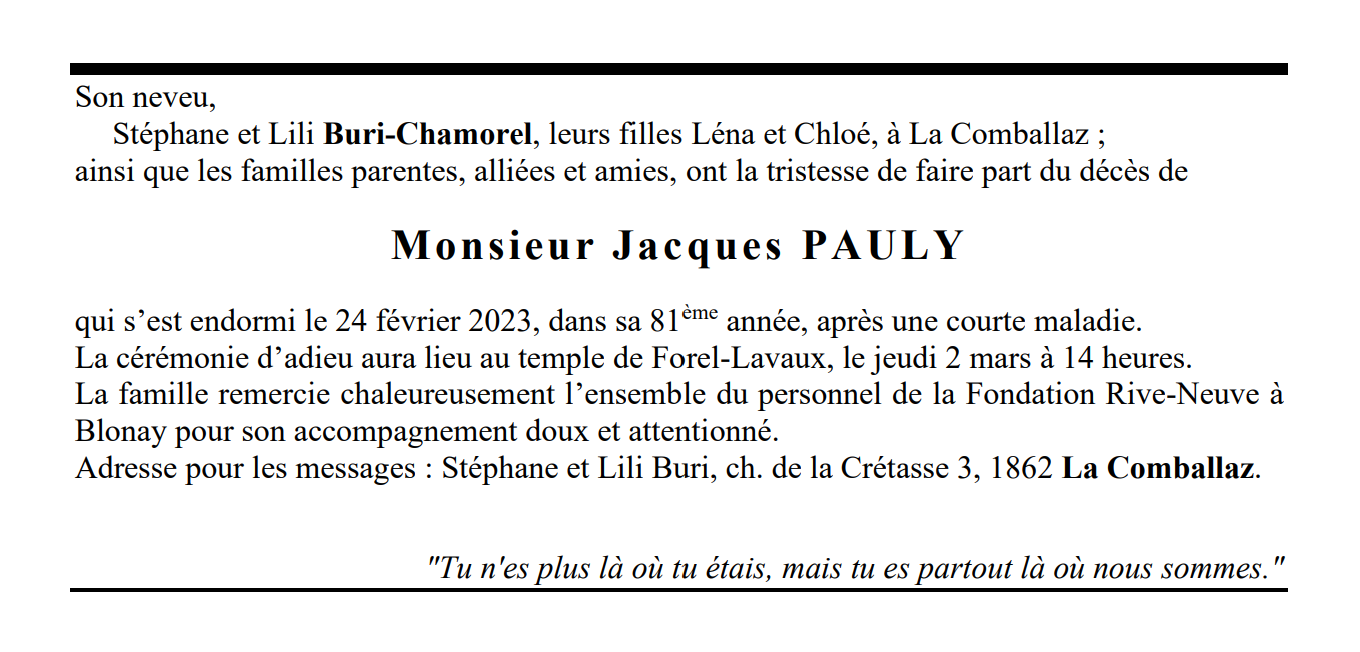 Monsieur Jacques PAULY 07 mar. 1942 - 24 fév. 2023 Avis mortuaire PFG Télecharger PDF Partager sur: Galerie PreviousNext PreviousNext