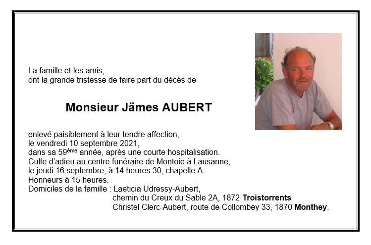 Monsieur Jämes AUBERT 23 nov. 1962 - 10 sep. 2021 Avis mortuaire PFG Télecharger PDF Partager sur: Galerie PreviousNext PreviousNext