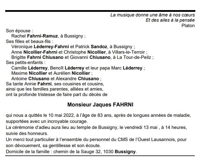 Monsieur Jaques FAHRNI 01 avr. 1939 - 10 mai. 2022 Avis mortuaire PFG Télecharger PDF Partager sur: Galerie PreviousNext PreviousNext