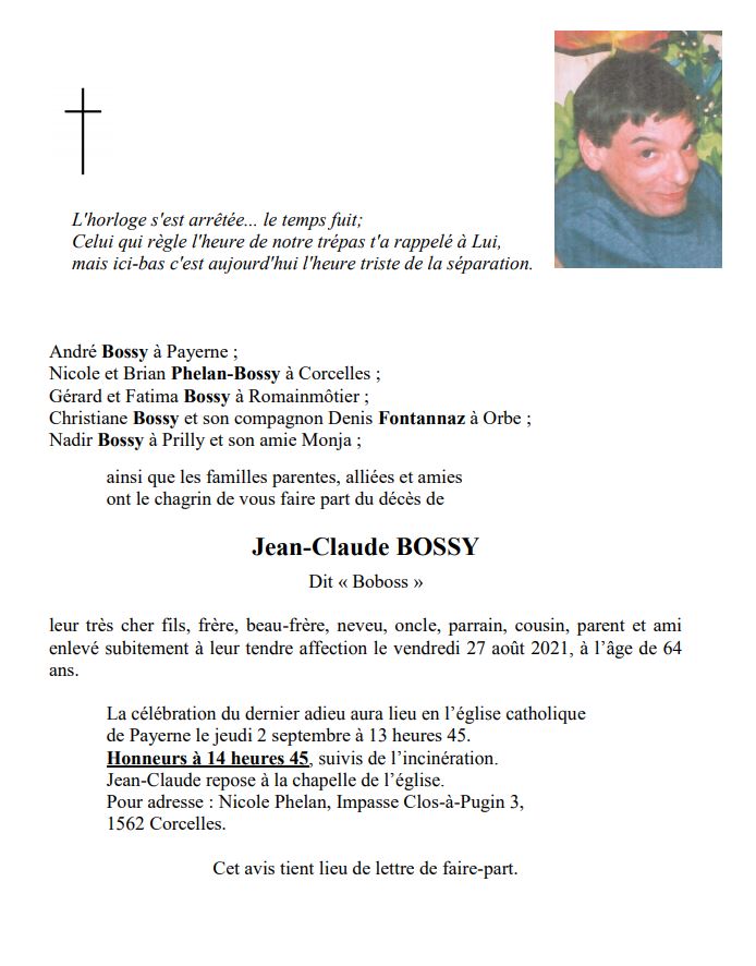 Monsieur Jean-Claude BOSSY, dit Boboss 21 mai. 1957 - 27 aoû. 2021 Avis mortuaire PFG Télecharger PDF Partager sur: Galerie PreviousNext PreviousNext
