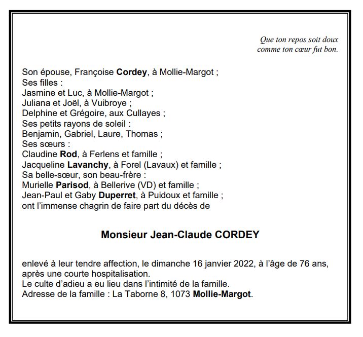 Monsieur Jean-Claude CORDEY 16 juil. 1945 - 16 jan. 2022 Avis mortuaire PFG Télecharger PDF Partager sur: Galerie PreviousNext PreviousNext