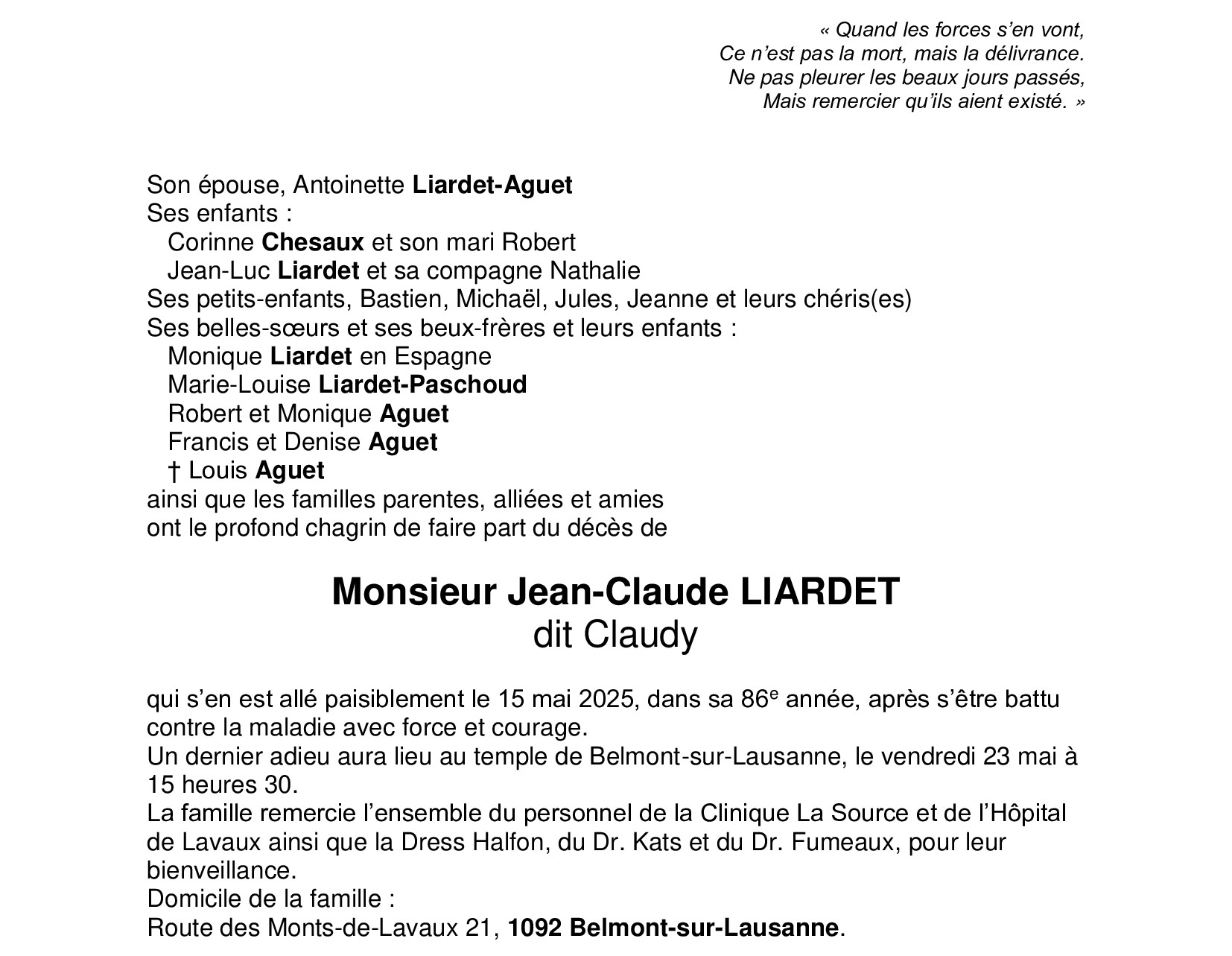Monsieur Jean-Claude LIARDET 30 mai. 1939 - 15 mai. 2025 Avis mortuaire PFG Partager sur: Galerie PreviousNext PreviousNext