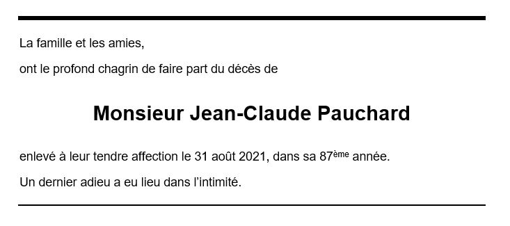 Monsieur Jean-Claude PAUCHARD 27 mar. 1934 - 31 aoû. 2021 Avis mortuaire PFG Télecharger PDF Partager sur: Galerie PreviousNext PreviousNext