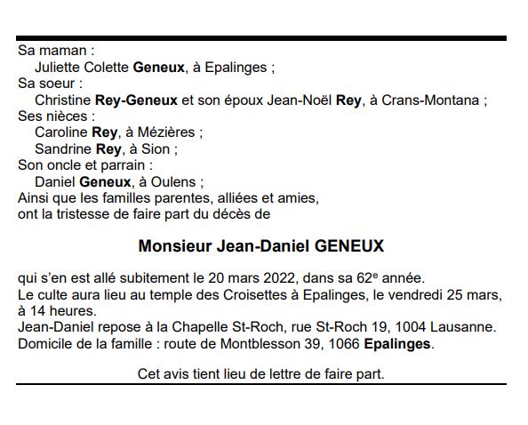 Monsieur Jean-Daniel GENEUX 14 déc. 1960 - 20 mar. 2022 Avis mortuaire PFG Télecharger PDF Partager sur: Galerie PreviousNext PreviousNext