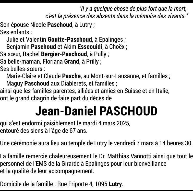 Monsieur Jean-Daniel PASCHOUD 07 oct. 1957 - 04 mar. 2025 Avis mortuaire PFG Partager sur: Galerie PreviousNext PreviousNext