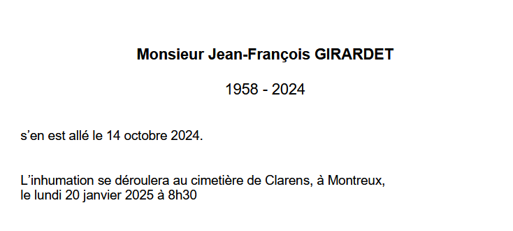 Monsieur Jean-François GIRARDET 23 jan. 1958 - 14 oct. 2024 Avis mortuaire PFG Télecharger PDF Partager sur: Galerie