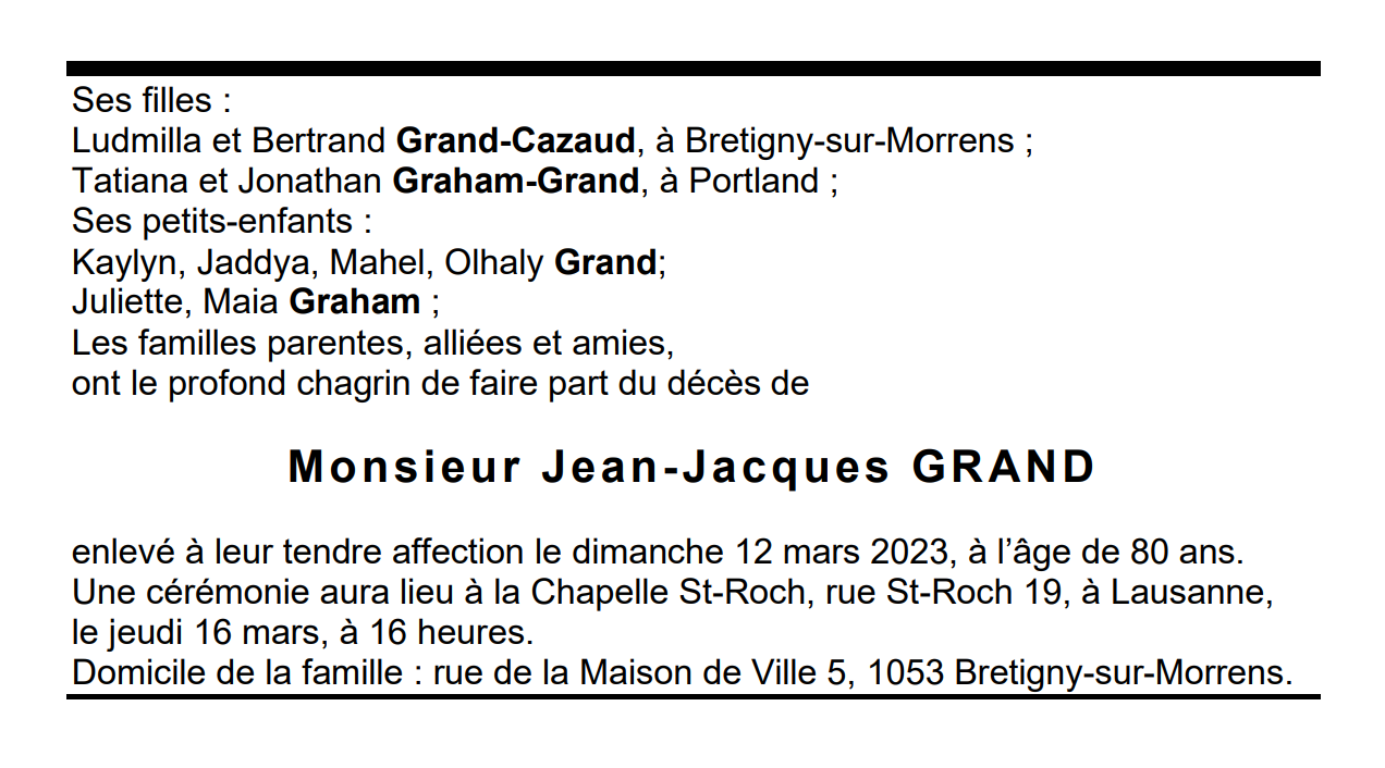 Monsieur Jean-Jacques GRAND 03 sep. 1942 - 12 mar. 2023 Avis mortuaire PFG Télecharger PDF Partager sur: Galerie PreviousNext PreviousNext