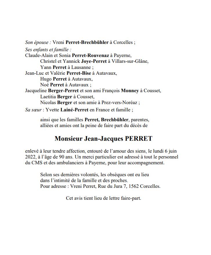 Monsieur Jean-Jacques PERRET 09 avr. 1932 - 06 juin. 2022 Avis mortuaire PFG Télecharger PDF Partager sur: Galerie