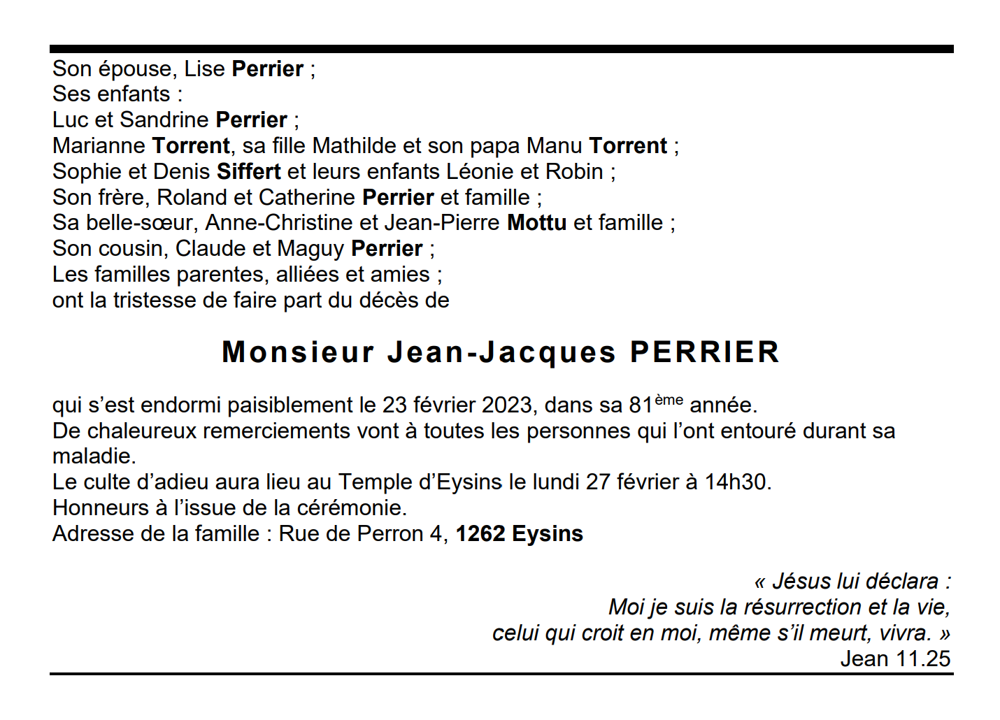Monsieur Jean-Jacques PERRIER 01 nov. 1942 - 23 fév. 2023 Avis mortuaire PFG Télecharger PDF Partager sur: Galerie PreviousNext PreviousNext