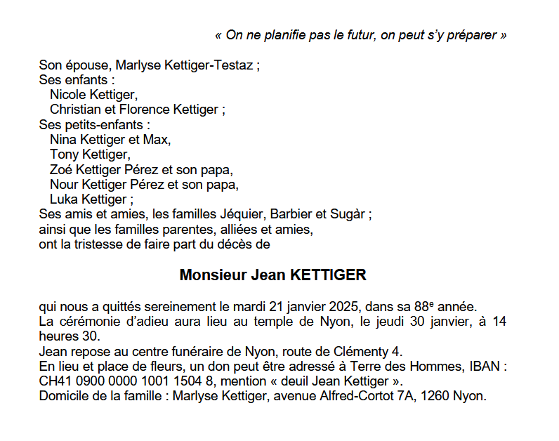 Monsieur Jean KETTIGER 18 aoû. 1937 - 21 jan. 2025 Avis mortuaire PFG Télecharger PDF Partager sur: Galerie