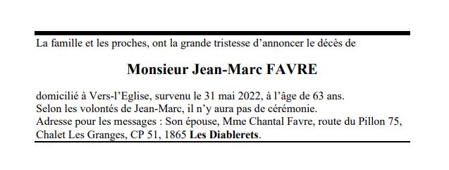 Monsieur Jean-Marc FAVRE 19 jan. 1959 - 31 mai. 2022 Avis mortuaire PFG Télecharger PDF Partager sur: Galerie PreviousNext PreviousNext