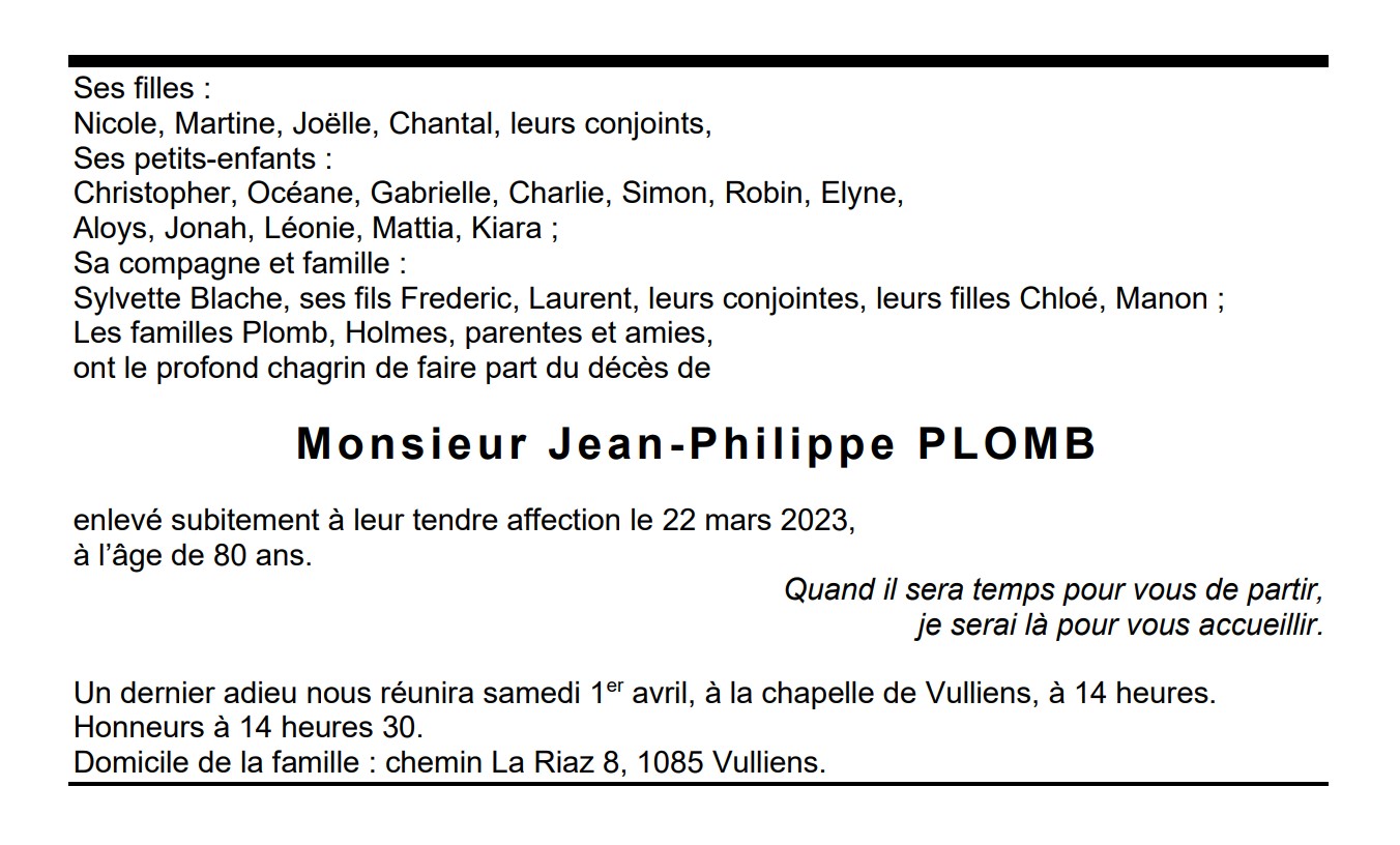 Monsieur Jean-Philippe PLOMB 01 aoû. 1942 - 22 mar. 2023 Avis mortuaire PFG Télecharger PDF Partager sur: Galerie PreviousNext PreviousNext