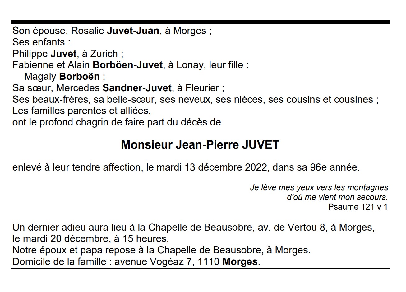 Monsieur Jean-Pierre JUVET 23 aoû. 1927 - 13 déc. 2022 Avis mortuaire PFG Télecharger PDF Partager sur: Galerie PreviousNext PreviousNext