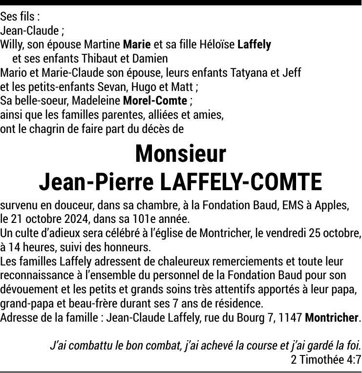 Monsieur Jean-Pierre LAFFELY-COMTE 16 nov. 1923 - 21 oct. 2024 Avis mortuaire PFG Partager sur: Galerie