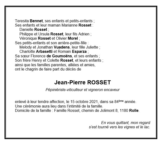 Monsieur Jean-Pierre ROSSET 28 nov. 1937 - 15 oct. 2021 Avis mortuaire PFG Télecharger PDF Partager sur: Galerie PreviousNext PreviousNext