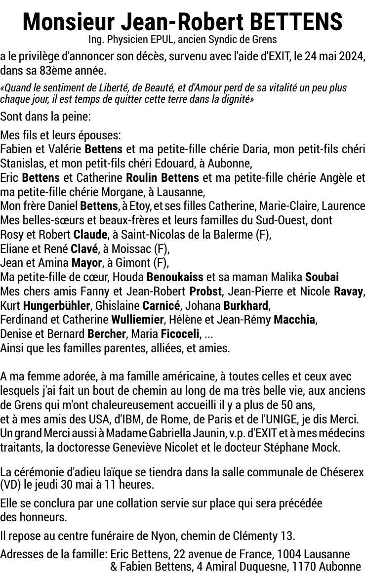 Monsieur Jean-Robert BETTENS 11 avr. 1942 - 24 mai. 2024 Avis mortuaire PFG Télecharger PDF Partager sur: Galerie PreviousNext PreviousNext