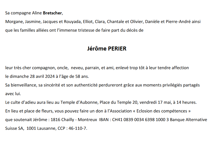 Monsieur Jérôme PÉRIER 19 mar. 1966 - 28 avr. 2024 Avis mortuaire PFG Télecharger PDF Partager sur: Galerie
