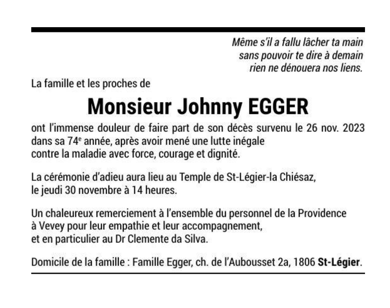 Monsieur Johnny EGGER 07 déc. 1949 - 26 nov. 2023 Avis mortuaire PFG Télecharger PDF Partager sur: Galerie PreviousNext PreviousNext