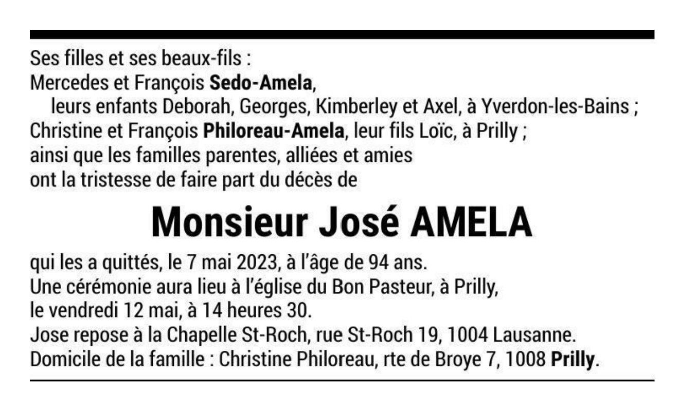 Monsieur José AMELA 17 avr. 1929 - 07 mai. 2023 Avis mortuaire PFG Télecharger PDF Partager sur: Galerie PreviousNext PreviousNext