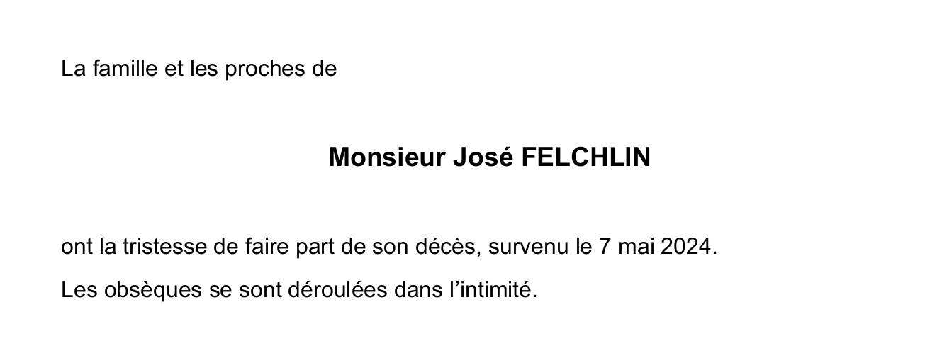 Monsieur José FELCHLIN 23 mai. 1958 - 07 mai. 2024 Avis mortuaire PFG Télecharger PDF Partager sur: Galerie PreviousNext PreviousNext