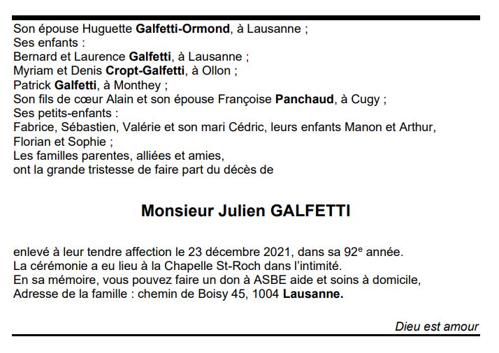 Monsieur Julien GALFETTI 27 juil. 1930 - 23 déc. 2021 Avis mortuaire PFG Télecharger PDF Partager sur: Galerie PreviousNext PreviousNext