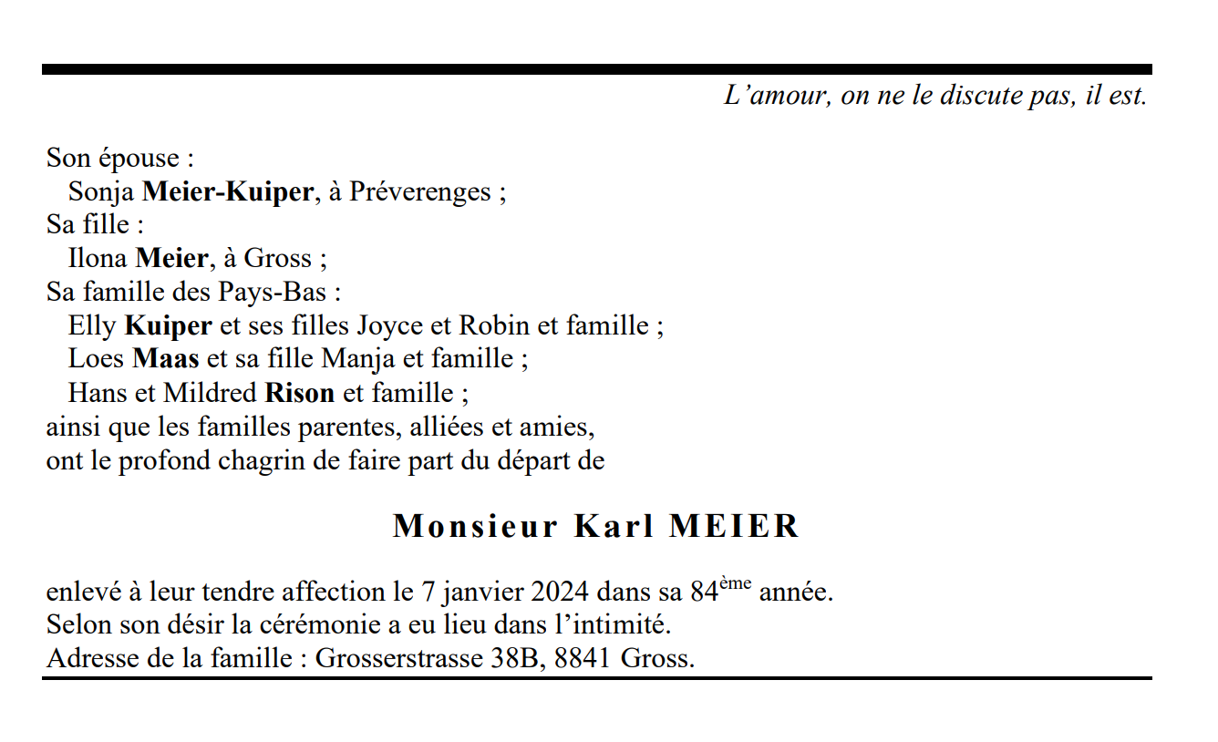 Monsieur Karl MEIER 17 mai. 1940 - 07 jan. 2024 Avis mortuaire PFG Télecharger PDF Partager sur: Galerie PreviousNext PreviousNext