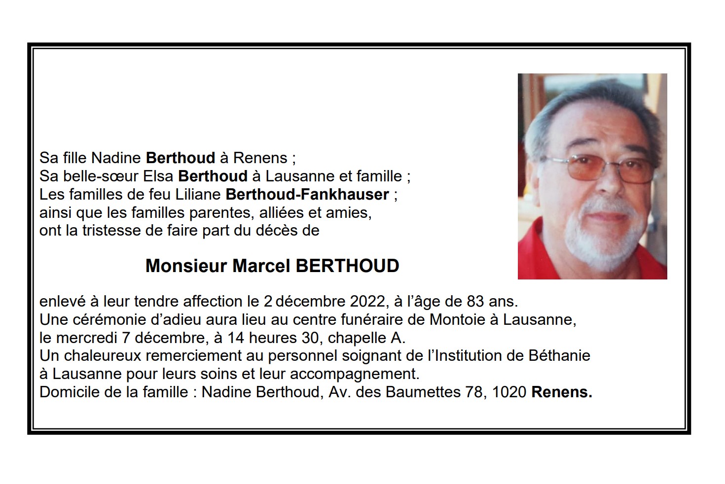 Monsieur Marcel BERTHOUD 12 avr. 1939 - 02 déc. 2022 Avis mortuaire PFG Télecharger PDF Partager sur: Galerie PreviousNext PreviousNext
