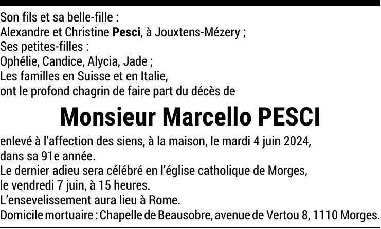 Monsieur Marcello PESCI 20 juin. 1933 - 04 juin. 2024 Avis mortuaire PFG Partager sur: Galerie PreviousNext PreviousNext