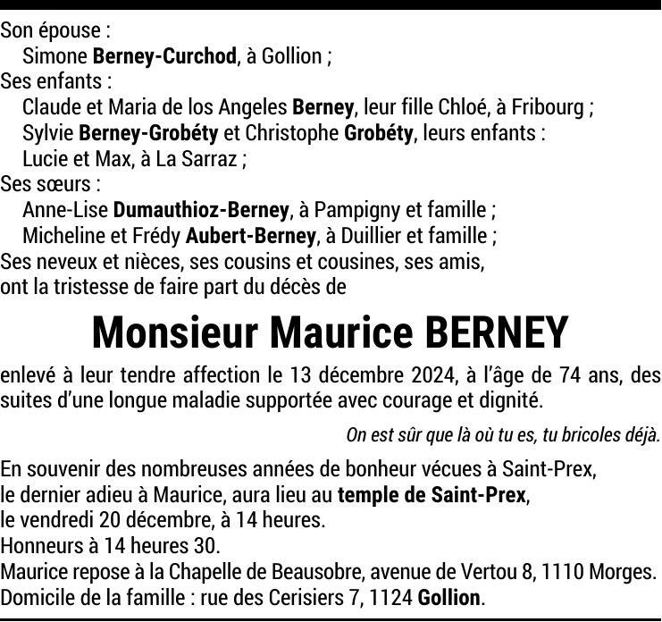 Monsieur Maurice BERNEY 12 jan. 1950 - 13 déc. 2024 Avis mortuaire PFG Partager sur: Galerie PreviousNext PreviousNext