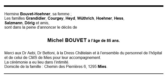 Monsieur Michel BOUVET 27 juil. 1936 - 06 oct. 2021 Avis mortuaire PFG Télecharger PDF Partager sur: Galerie PreviousNext PreviousNext