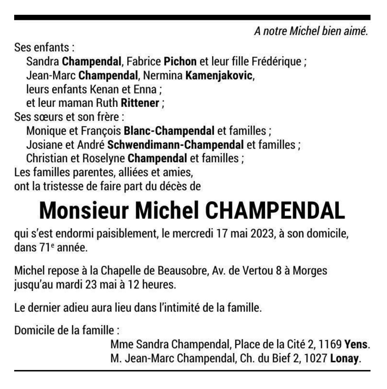 Monsieur Michel CHAMPENDAL 01 nov. 1952 - 17 mai. 2023 Avis mortuaire PFG Télecharger PDF Partager sur: Galerie PreviousNext PreviousNext