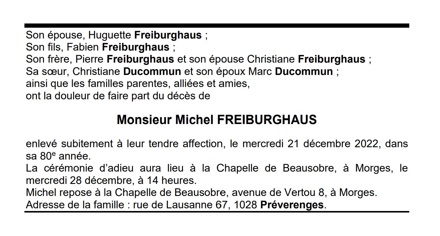 Monsieur Michel FREIBURGHAUS 15 juin. 1943 - 21 déc. 2022 Avis mortuaire PFG Télecharger PDF Partager sur: Galerie PreviousNext PreviousNext